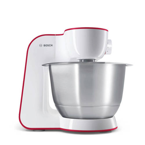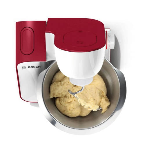 De Bosch MUM54R00 is een krachtige keukenmachine met een vermogen van 900 Watt, 3D PlanetaryMixing en een EasyArmLift. De MUM54R00 heeft 7 snelheden en een momentschakelaar en een elektronische toerenregeling voor een constante snelheid. De motor bouwt de snelheid geleidelijk op om spetteren te voorkomen. De rvs mengkom heeft een inhoud van 3.9 liter wat goed is voor maximaal 2.7 kg cakebeslag of 1.9 kg gistdeeg. De automatische parkeerstand maakt het vullen van de kom gemakkelijk.3D PlanetaryMixingSnel en perfect mengen van alle ingrediënten, dankzij het verbeterde planetaire mengsysteem met een uniek roterende beweging in drie dimensies tegelijk.EasyArmLiftGemakkelijk en moeiteloos verplaatsen van de 3-zone multifunctionele arm door een druk op de knop en eenvoudig vullen van de kom dankzij de automatische parkeerstand positie.Meegeleverde toebehoren1 x Deksel, 1 x Roestvrijstalen mengkom, 1 x Metalen kneedhaak, 1 x Klopper Specificaties- Vermogen: 900 Watt- Kliksystem- 7 snelheidsstanden en een momentstand- Transparant anti-spatdeksel met vulschacht- Alle kunststof materialen welke in contact komen met voedsel zijn BPA vrij- Oververhittingsbeveiliging- Herinschakelingsbeveiliging- Met Interactieve recepten DVD en handige opbergtas - Kleur: wit/rood- Garantietermijn: 2 jaar