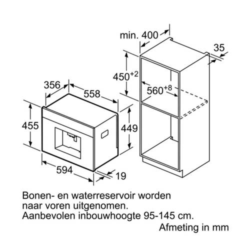 Deze Siemens CT636LES6 Compacte inbouw espresso koffiemachine kun je gemakkelijk bedienen met de Home Connect App op je smartphone, en je hoeft er de bank niet vanaf te komen. Je kunt zelfs bestellingen (coffeePlaylist) voor diverse koffievarianten aannemen van je gasten en deze doorsturen naar de CT636LES6. De koffiemachine bereidt vervolgens de koffiewensen op volgorde van de lijst. Zo worden vergissingen voorkomen en krijgt eenieder z’n favoriete kopje koffie. Koffierecepten: Voor veel gerechten, dranken of desserts, zoals espresso crème brûlée, is koffie nodig als ingrediënt. Je apparaat is daar met Home Connect perfect op voorbereid. Kies eenvoudigweg voor één van de voorgeprogrammeerde recepten en start de bereiding op afstand.De CT636LES6 heeft Intelligent Heater inside: Het sensoFlow System garandeert elke keer weer de maximale espressosmaak, dankzij de ideale constante zettemperatuur. En met de aromaDouble Shot zet je een extra sterke koffie met een minder bittere smaak dankzij het dubbele maalproces. De maximale druk in de zetkamer is 19 bar. Verder zorgt het coffeeSensor System ervoor dat een intelligente maler zich aan elke boonsoort aanpast en altijd de perfecte hoeveelheid maalt. Ook kun je dankzij de One-touch functie een Ristretto, Espresso, Espresso Macchiato, Café Crème, Cappuccino, Latte Macchiato, of Koffie verkeerd met één druk op de knop bereiden. De CT636LES6 heeft een automatisch ontkalkingssysteem, multilevel maalgraad, een melkopschuimer via de melkslang en heet water functie. De koffiesterkte en waterhoeveelheid zijn instelbaar. Op het digitale display met interactief menu is alles eenvoudig in te stellen. Verder is koffie uitloop in hoogte te verstellen: zelfs 15cm hoge Latte Macchiato glazen passen er onder. En kleine vingertjes kunnen dankzij de kinderbeveiliging geen instellingen meer wijzigen. Home Connect: bedien je huishoudapparaten, waar je ook bent.Met Home Connect kun je huishoudelijke apparaten van verschillende Europese merken gemakkelijk en intuïtief via je smartphone of tablet bedienen. Je hebt geen speciale smartphone of tablet nodig, het enige wat je nodig hebt is een apparaat met de Home Connect functionaliteit en de app. Deze is gratis te downloaden, zodat je vanaf je bank je koffiemachine kunt aanzetten of in de supermarkt wilt weten of er nog spoelglansmiddel voor je vaatwasser moet meenemen. Je kunt zelfs in je koelkast kijken, het is nu allemaal mogelijk met Home Connect.- individualCup Volume: de hoeveelheid koffie is individueel aan te passen, zodat je kopje precies zo vol is als je het wilt.- Tijdige indicatie bonen- en/of waterreservoir leeg-oneTouch DoubleCup: Twee kopjes tegelijkertijd bereiden voor alle koffie- en melk specialiteiten- Flexibele melktoevoer: bepaal zelf om de meegeleverde melkreservoir te gebruiken of direct uit een melkpak te laten nemenKeramische koffiemolenDe hoogwaardig keramische schijven van het maalwerk van de CT636LES6 zorgt ervoor dat de smaak van de koffiebonen niet wordt beïnvloed. Aroma Double Shot Extra sterke koffie zonder dat het bitter wordt, door een dubbel maal- en zetprocesIndividueel koffiegenot. Met één druk op de knop.Met myCoffee-systeem drink jij je koffie zoals jij die het liefst drinkt: tot acht koffiedrinkers kunnen hun instellingen opslaan. Van de favoriete sterkte tot de grootte van de kop kunnen op elk moment met een druk op de knop heel eenvoudig worden opgeroepen.coffeeSensor-systeemBonensoorten verschillen op veel gebieden, zoals grootte, vochtigheid en oliegehalte van de bonen. Het intelligente maalmechanisme van het coffeeSensor-systeem herkent en past de maalduur automatisch aan de bonensoort aan. Zo krijg je met een constante poederhoeveelheid steeds de door jou gewenste koffiesterkte.Reiniging: - Uitneembare zetgroep: eenvoudig en hygiënisch te reinigen onder de kraan- AutoMilkClean: Volautomatische stoomreiniging van het melksysteem na ieder bereid koffie- of melkspecialiteit- Melkschuimer eenvoudig afneembaar en vaatwasbestendig- singlePortion cleaning functie voor een optimale smaak en hygiëne: Alle leidingen worden volledig geleegd na iedere bereiding- Volautomatisch spoelprogramma bij in- en uitschakelen- Lekschaal en koffiedikreservoir uitneembaar en vaatwasbestendig- calc'nClean: automatisch reinigings- en ontkalkingsprogramma- Weergave: voordat apparaat ontkalkt en/of gereinigd moet worden-Afmetingen en gewicht- Inbouw afmetingen (hxbxd): 44,9x55,8x35,6 cm- Afmetingen (hxbxd): 45.5x59.4x38.5 cm- Gewicht: 22,4 kg