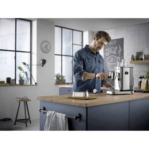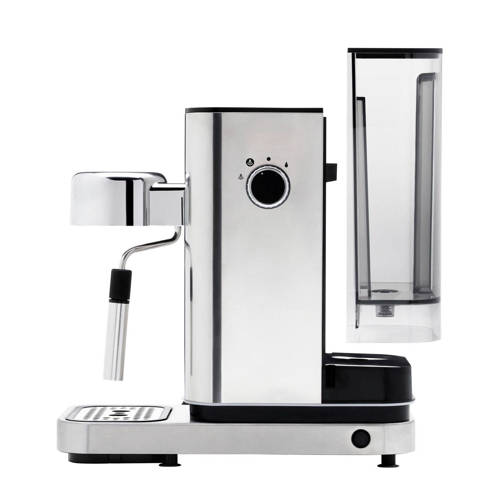 Met deze WMF 0412360011 Lumero espressomachine maak jij thuis de lekkerste espresso’s. De temperatuur kun je zelf instellen met behulp van de bedieningsknop aan de zijkant van de machine. Als het water op is of wanneer de machine onderhoud nodig heeft, dan kun je dat zien aan de verlichting rondom deze knop, die licht op in de relevante kleur. Met behulp van het regelbare stoompijpje maak je een heerlijke cappuccino of Latte-macchiato. Het stoompijpje heeft een radius van wel 180° en kan dus zowel links als rechts gebruikt worden. Het thermoblock zorgt voor een snelle opwarming (30-40 sec.) en houdt de kopjes warm boven op de machine.Specificaties- Pompdruk 15 bar- LED-verlichting- Vermogen: 1400 Watt