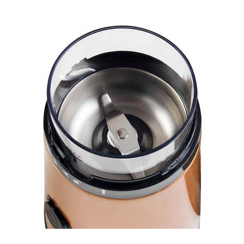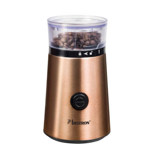 Bestron ACG1000CODe Bestron ACG1000CO is een koper look elektrische koffiemolen met een capaciteit van 50 gram. De koffiemolen is geschikt voor alle soorten koffiebonen.Kenmerken:- Geschikt voor alle soorten koffiebonen- Transparant, afneembaar reservoir met capaciteit van 50 gr.- Krachtige motor- RVS slagwerksysteem- Afneembare deksel- Eenvoudig te reinigen- Antislipvoetjes- Met GS-gecertificeerd keurmerk = extra hoge kwaliteit en veiligheidsstandaard- 5 jaar garantie- Aansluitspanning 220 - 240 Volt AC 50-60 Hz- Vermogen 150 watt
