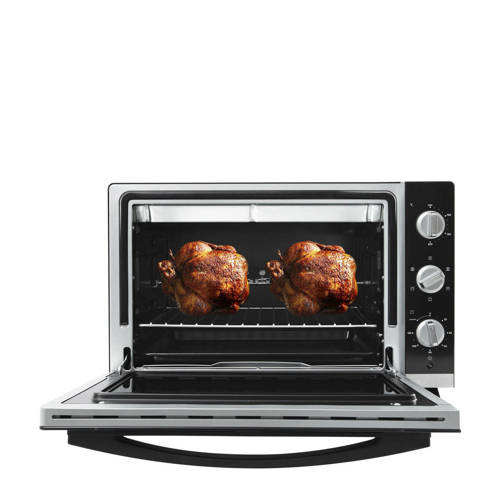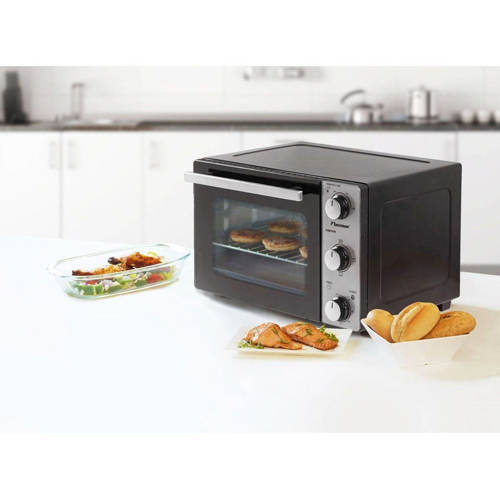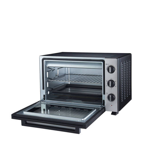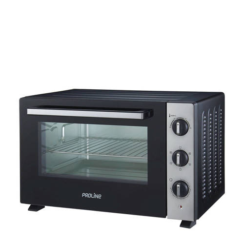 Deze Proline PMF46X mini grill-oven heeft een inhoud van 46 liter en een vermogen van 1800 Watt. De PMF46X heeft 6 ovenfuncties en de maximum temperatuur van de oven is 230ºC. Met de 60-minuten timer kun je nauwkeurig de kooktijd instellen.Met natuurlijke convectie: voor al het traditionele koken, ideaal om al jouw voedselbereidingen met behoud van de knapperigheid. Ook geschikt om al jouw bereidingen tot in de perfectie bruin te maken en te gratineren en voor het maken van bijvoorbeeld al jouw gebak en fruittaarten.GebruiksgemakVoor het gebruiksgemak heeft deze compacte mechanische oven 3 regelaars: een thermostaat, een timer en een keuzeschakelaar voor de kookmodus. Pas de verwarmingstemperatuur aan de te maken schotel aan met de thermostaat die instelbaar is van 100° tot 230°.De mini oven wordt geleverd met een kruimellade, een ovenrooster, een draaispit, een handvat en een bakplaat.Afmetingen en gewicht- Afmetingen (hxbxd) 37,5x58,8x44 cm - Gewicht: 11,7 kg