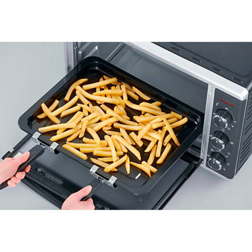 Deze praktische Princess heteluchtoven is perfect voor grillen, bakken en ontdooien, en dat zonder het gebruik van microgolven!Je kunt vlees, groenten en zelfs een quiche bereiden. De oven is zelfs geschikt om knapperig brood en pizza's te bakken. De convectieoven heeft 4 verwarmingselementen en een inhoud van 45 L. Hij heeft een temperatuurbereik van 90 tot 230 °C, een timer en een unieke ontdooifunctie. Door het grote venster kan je je eten in de gaten houden.De oven is erg makkelijk schoon te maken dankzij de vuilafstotende wanden en de uitneembare kruimelplaat.