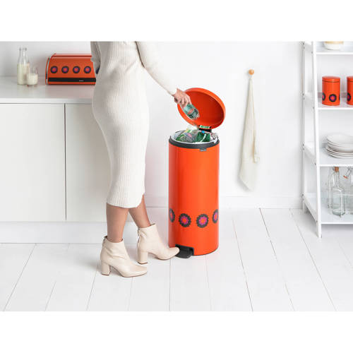 Brabantia viert haar 100ste verjaardag met de herlancering van de iconische Patrice print. De wereldberoemde bloemenprint uit 1969 komt opnieuw tot leven en bloeit op op de Brabantia newIcon pedaalemmer van 30 liter met kunststof binnenemmer, een retro look gecombineerd met modern comfort en duurzaamheid. Genoeg capaciteit voor al je afval. Brabantia’s newIcon pedaalemmers zijn niet alleen iconische schoonheden, ze zijn ook betrouwbare hulpjes in de huishouding. Stevig en altijd stabiel, dankzij hun antislip onderkant en anti-kantel blok. Dankzij de unieke soft-closure techniek sluit het deksel soepel en stil. En natuurlijk zijn newIcon pedaalemmers geurdicht en makkelijk te openen, te verplaatsen en schoon te houden. Je kunt makkelijk afval weggooien zonder te morsen dankzij de grote inwerpopening. Van deze pedaalemmers heb je jaren probleemloos plezier, echt waar (voor je geld). Met de aanschaf van deze pedaalemmer help je onze wereld wat schoner te maken want Brabantia gaat plastic uit de wereldse wateren 'vissen'. Voor elke verkochte newIcon pedaalemmer steunt Brabantia The Ocean Cleanup bij de grootste schoonmaak uit de geschiedenis. Een slim zuiveringssysteem, uitgevonden door de toen 17-jarige Boyan Slat, gebruikt de stromingen in zee en zou in theorie in vijf jaar tijd de helft van het plasticafval in de Stille Oceaan kunnen opruimen. Met zo’n mooi initiatief gaan we graag in zee. Mooi toch? • Deksel sluit geruisloos en superlicht te bedienen pedaal• Reukdichte deksel• Gemakkelijk te reinigen/uitneembare binnenemmer• Anti-slip bodem/beschermt de vloer en pedaalemmer staat stabiel• Gemakkelijk te verplaatsen/slimme handgreep in dekselscharnier• Inclusief proefverpakking van Brabantia PerfectFit afvalzakken (code G)/gemakkelijk en praktisch onzichtbaar aan te brengen• 10 jaar garantie en service• Cradle to Cradle gecertificeerd/goed doen voelt goed