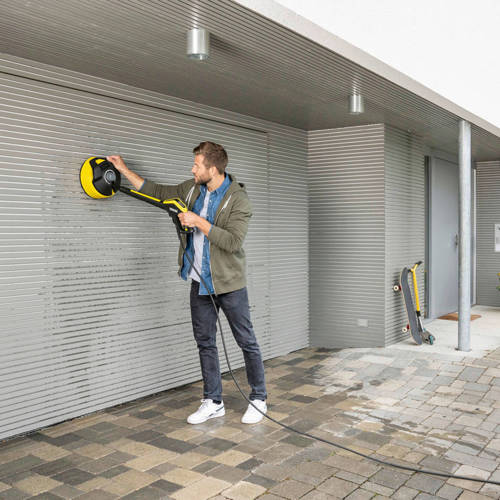 De roterende arm met twee stralen van deT-RacerT 5 oppervlaktereiniger kan vuil over grote oppervlakken verwijderen - voor snelle en efficiënte reiniging van grote buitenoppervlakken. Uiterst praktisch: de oppervlaktereiniger kan worden aangepast zodat het mondstuk op de ideale afstand van het oppervlak wordt geplaatst, afhankelijk van het materiaal. Dit betekent dat harde oppervlakken, zoals steen en beton, net zo effectief kunnen worden gereinigd als meer delicate oppervlakken, zoals hout. Als gevolg hiervan reinigt deT-RacerT 5 in ongeveer de helft van de tijd die een spuitlans nodig heeft. Bovendien beschermt de kap op betrouwbare wijze de gebruiker en de omgeving tegen spatwater en het 'hovercraft-effect' maakt manoeuvreren eenvoudiger dan ooit. Zelfs verticale oppervlakken, zoals garagedeuren, kunnen efficiënt worden gereinigd dankzij de ergonomische handgreep. Geschikt voor Kärcher hogedrukreinigers van K 2 tot K 7.