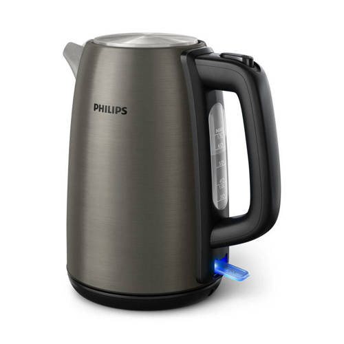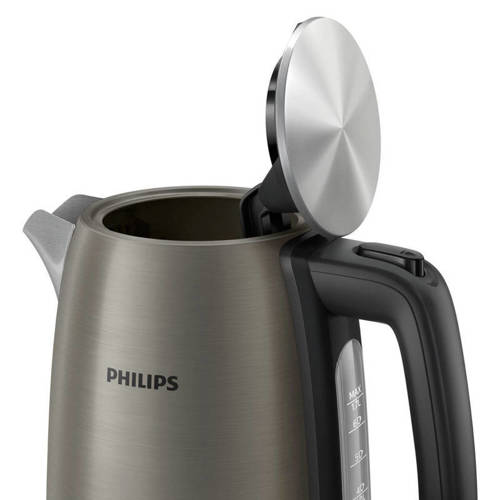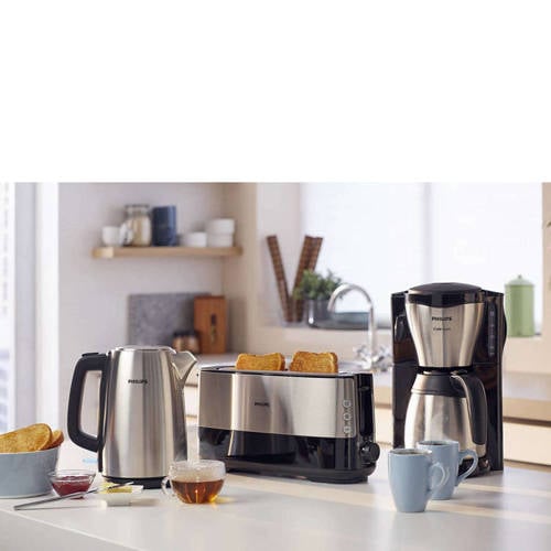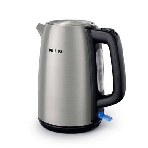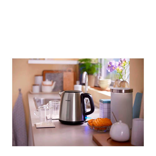 Volledig roestvrij staal met extra grote opening Duurzame waterkoker van voedselveilig volledig roestvrij staal voor langdurig en betrouwbaar gebruik, dag na dag. Deze elegante en duurzame Philips-waterkoker is gemaakt met meer dan 60 jaar beproefde ervaring.Roestvrijstalen design Duurzaam ontwerp volledig van voedselveilig geborsteld roestvrij staal voor langdurig en betrouwbaar gebruik. Fijnmazig filter Een uitneembaar fijnmazig filter op de tuit vangt minuscule kalkaanslagdeeltjes zo klein als 200 micron voor een heldere beker. Plat verwarmingselement Een verborgen, roestvrijstalen verwarmingselement zorgt voor snel koken en eenvoudig schoonmaken. Veelzijdig beveiligingssysteem De waterkoker wordt automatisch uitgeschakeld wanneer het water kookt, wanneer deze uit het voetstuk wordt getild of wanneer er te weinig water in zit (om droogkoken te voorkomen). Indicatielampje Stijlvol indicatielampje in de aan-uitknop brandt als de waterkoker is ingeschakeld. Waterniveau-indicator Het waterniveau is eenvoudig af te lezen met een indicator onder de handgreep. Deksel met veermechanisme en een grote openingEen deksel met drukknop opent soepel met één druk op de knop en voorkomt contact met stoom. De grote opening maakt schoonmaken eenvoudiger. Gemakkelijk hervullen De waterkoker kan worden gevuld via de tuit of door het deksel met veermechanisme te openen.