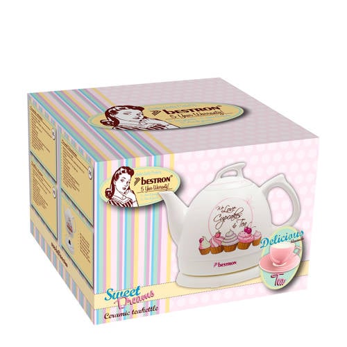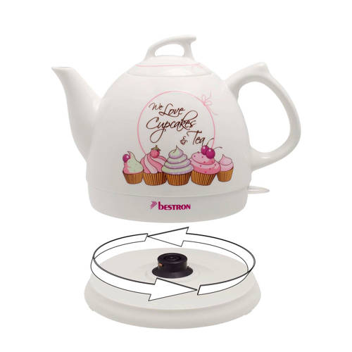 Bestron DTP800SD decoratieve keramische waterkoker/theepot in wit met rose met een inhoud van 0.8 liter en een vermogen van 1800 watt. De DTP800SD is snoerloos, kan direct aan tafel worden gebruikt. De waterkoker heeft een automatische afslag, een afneembaar deksel met veiligheidssluiting en een geïntegreerd verwarmingselement, ongevoelig voor kalkaanslag. Met 2 jaar garantie.Specificaties:- Vermogen: 1800 watt- Inhoud: 0.8 liter- Automatische afslag- Droogkookbeveiliging- Geïntegreerd verwarmingselement, ongevoelig voor kalkaanslag- 360 graden draaibaar- Snoerloos- Snoeropberging- Antislipvoetjes - Afneembaar deksel met veiligheidssluiting- Aan-/Uitschakelaar met indicatielampje- Kleur: wit met rose- Garantietermijn2 jaarAfmetingen en gewicht:- Afmeting (hxbxd): 19x16x23.5 cm- Gewicht: 1.36 kg