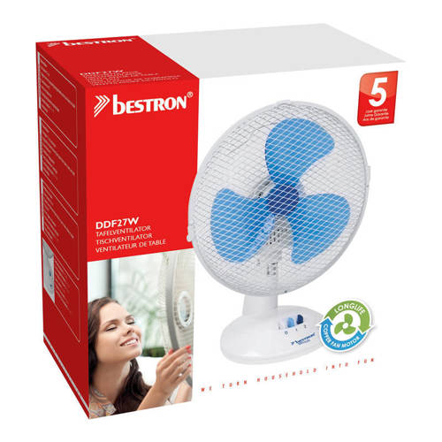 De Bestron DDF27W tafelventilatormet een korf van 27 cm, is uitgerust met een hoogwaardig, koper gewikkelde motor met een vermogen van 30 Watt. DeDDF27W heeft onder andere een zwenkfunctie van 75° en een verticaal verstelbare korf met krachtige aerodynamische ventilatorbladen en 3 vermogensstanden. De ventilator inde kleur witwordt geleverd met 2 jaar garantie.Specificaties- Vermogen30 watt- Korf diameter:27 cm- Krachtige aërodynamische ventilatorbladen- Aantal standen: 3- Anto slipvoetjes- Kleur: wit/blauw- 2 jaar garantieAfmetingen en gewicht- Afmetingen (hxbxd): 35x27x21 cm- Gewicht: 1,2 kg
