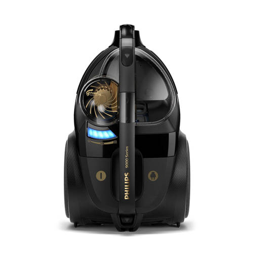 Met zijn 900W motor is de series 9000 de stofzuiger met de hoogste zuigkracht in zijn klasse. De stofzuiger is geschikt voor diepe reiniging van tapijt en harde vloeren. Ondersteund door het TriActive Ultra-mondstuk zorgt dat je alles kunt reinigen zowel voor als achterwaarts. Dankzij de ergonomische handgreep, met geïntegreerde afstandsbediening, is stofzuigen nooit zo comfortabel geweest. De grote roterende turboborstel is ideaal voor het verwijderen van hardnekkig vuil uit jouw tapijt.De allergiefilter vangt meer dan 99,9% van fijnstof en allergenen opDe Allergy H13 allergiefilter filtert meer dan 99,9% van fijnstof, pollen, allergenen en huisstofmijt op. Door deze hoge performance is deze stofzuiger uitermate geschikt voor mensen met mensen met een allergie, huisdiereneigenaren of mensen die een hygiënische omgeving wensen. Het filtratieniveau is gelijk aan de HEPA 13 standaard.Ultieme controle over jouw stofzuigerStofzuigen is nog nooit zo comfortabel geweest, dankzij de ergonomische handgreep met geïntegreerde afstandsbediening en krachtregeling. Met behulp van de handgreep is de stofzuiger eenvoudig en comfortabel te manoeuvreren. Dankzij de afstandsbediening hoef je niet te bukken om de stofzuiger aan of uit te zetten, of de zuigkrachtinstelling te wijzigen.Zachte borstel geïntegreerd in de handgreepIn de handgreep is een zachte borstel geïntegreerd die altijd gebruiksklaar is om eenvoudig meubilair, bekleding en vlakke oppervlakken schoon te maken, zonder krassen te veroorzaken. Het meubelmondstuk maakt zachte meubels schoon en verwijdert eenvoudig haar van huisdieren. Het meegeleverde spleetmondstuk is ideaal voor de reiniging van moeilijk bereikbare plekken, zoals hoekjes en kieren.Ontworpen voor hygiënisch legen met één handDe stofbak is ontworpen zodat deze hygiënisch kan worden verwijderd en met één hand geleegd kan worden. De NanoClean-technologie zorgt dat stof naar de bodem van de bak glijdt, waardoor stofwolken bij het leegkappen en morsen van stof en vuil wordt voorkomen.PowerCyclone 10 zorgt voor een continue hoge zuigkrachtDe PowerCyclone 10-technologie zorgt voor de continue hoge zuigkracht. Het aerodynamische ontwerp van de cyclonische kamer is geoptimaliseerd voor een krachtige wervelende beweging en vermindert de luchtweerstand en zorgt in 3 zeer efficiënte stappen voor optimale schoonmaakresultaten: 1) Dankzij de rechte, egale luchtinlaat gaat de lucht snel de PowerCyclone in. 2) De gebogen luchtdoorlaat versnelt de opgaande luchtstroom in de cyclonische kamer. 3) Boven in de cyclonische kamer wordt de stof effectief van de lucht gescheiden door de uitlaatbladen. Geniet van hoge prestaties voor een schoon huis. Het TriActive Ultra-mondstuk reinigt diep en aan alle kanten