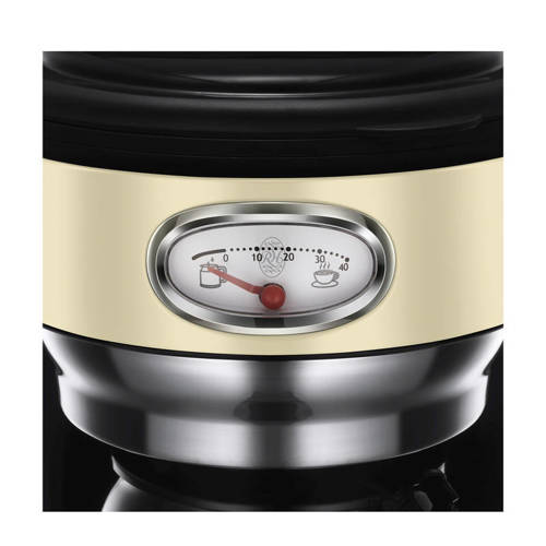 Dit Russell Hobbs 21700-56 Retro Vintage Cream, RVS koffiezetapparaat met fraaie retroaccenten heeft een glazen koffiekan met een inhoud van 1.25 liter wat goed is voor 10 kopjes vers gezette koffie. Achter zijn retrostijl gaan allerlei innovatieve functies schuil die bedoeld zijn om je koffiezetbeleving én de smaak van het eindresultaat te verbeteren. Zo heeft dit Retro koffiezetapparaat een grote, stijlvolle voortgangsindicator voor het koffiezetproces, die meer is dan alleen maar een charmante designfunctie; hiermee kun je ook het brouwproces in de gaten houden en zien hoelang de warmhoudfunctie actief is. De pauzeer- en schenkfunctie stopt het brouwproces, als je alvast een eerste kopje wilt, tijdens het zetten van de rest van de koffie. De warmhoudfunctie zorgt ervoor dat je tweede of derde kopje nog net zo heet is als het eerste. Het handige maatschepje helpt je precies de juiste hoeveelheid koffie af te meten voor het aantal kopjes dat je zet.Specificaties:- Inhoud: 1.25 liter (10 kopjes)- Vermogen: 1000 Watt- Glazen koffiekan- Permanente afwasbare filterhouder- Waterniveau-indicator- Pauzeer & schenk-functie- Koffie-indicator toont zetproces en warmhoudtijd- Snoerlengte: 61 cm- Kleur: creme/zwart- Garantietermijn: 2 jaar