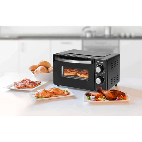 Bestron mini oven AOV9Specificaties:- Goed geïsoleerde behuizing voor geringe oppervlakte-warmte- Dubbelwandige glazen deur met hittebestendige handgreep- Instelbare temperatuur tot 220°C- 60 Minuten timer met eindsignaal, schakelt automatisch uit- Indicatielampje- Ovenruimte ca. 9 liter- 2 RVS warmte-elementen voor boven- en onderwarmte, ca. 800W- Met grillrooster, bakschaal en handige uitneemgreep- 2 verschillende roosterhoogtes- Eenvoudig te reinigen- Buitenafmetingen: B = 375mm, D = 290mm, H = 220mm- Binnenafmetingen: B = 250mm, D = 210mm, H = 160mm- Met GS-gecertificeerd keurmerk = extra hoge kwaliteit en veiligheidsstandaard