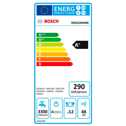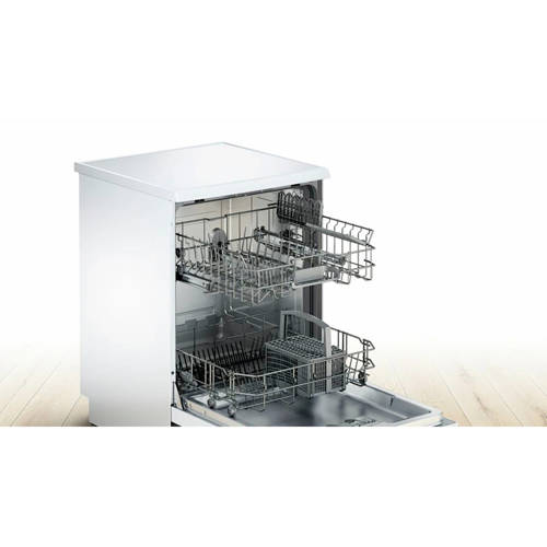 De Bosch SMS25AW00E vaatwasser is met 48dB onopvallend en stil op de achtergrond druk voor je aan het werk. De vaatwasser beschikt over vierverschillende programma's zoals Intensief 70 en Eco 50. In de vaatwasser is plek voor 12 standaard couverts. De Bosch SMS25AW00E vaatwasser beschermt je glazen, flessen en vazen extra goed het glasbeschermingssysteem. Hiermee regelt de vaatwasser de hardheid van het water, zodat zelfs je fijnste glazen met de grootst mogelijke zorg worden behandeld. Verder beschikt de vaatwasser over energieklasse A+, kinderbeveiliging, in hoogte verstelbare bovenkorf en een doseerassistent welke het vaatwasmiddel gelijkmatig verspreid. Ook beschikt hij over een AquaStop voor een 100% gegarandeerde bescherming tegen waterschade gedurende de levensduur van het apparaat. Deze vaatwasser is wit, vrijstaand, geschikt voor onderbouw en 60 cm. Milieuvriendelijke vaatwasser De Bosch SMS25AW00E is zeer milieuvriendelijk. Hij levert namelijk uitzonderlijke reinigingsprestaties met minder water en energie. Door verschillende technieken wordt water en energie bespaard voor een betere watercirculatie. En de AquaSensor past het waterverbruik aan op basis van het type en de hoeveelheid vuil. Afhankelijk van de hoeveelheid vuil en resten van vet of afwasmiddel bepaalt de AquaSensor of het nodig is om het spoelproces voort te zetten.