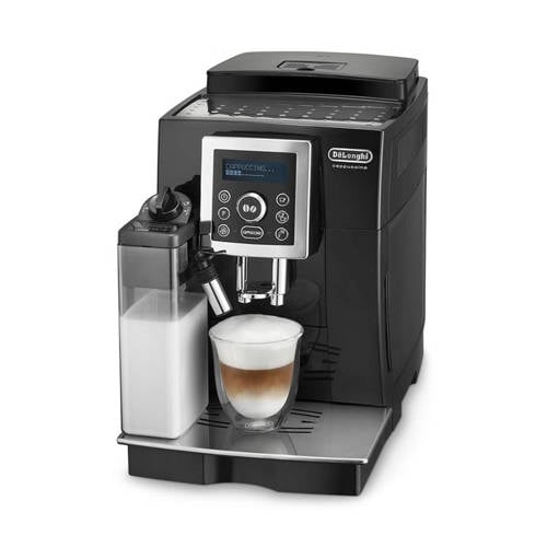 Bereid met het gepatenteerd LatteCrema Systeem van de espressomachine ECAM 23.460 je perfecte cappuccino, latte macchiato, caffè latte of warme melk met slechts één druk op de knop. Deze espressomachine is voorzien van een gebruiksvriendelijk display met 2 lijnen tekst om uw favoriete koffie naar eigen wens in te stellen.Slim geheugenCappuccino, latte macchiato, caffè latte, espresso, lungo,… de ECAM23.460 bereid je al deze dranken met 1 druk op de knop. Voor alle bereidingen kunnen de hoeveelheden ingesteld of geprogrammeerd worden naar eigen wens. Eigen kopjes waarvan de inhoud niet exact overeenkomt met de geprogrammeerde hoeveelheden. Geen probleem, op de geheugentoets “Mijn koffie”, programmeer je deze hoeveelheid zelf. De hoeveelheid melk en koffie voor een cappuccino is eveneens programmeerbaar. Er staan wel standaardhoeveelheden ingesteld vanuit de productie.Wil je dat je apparaat alvast voorverwarmd is wanneer je ’s ochtends wakker wordt? Dan kan je een bepaalde starttijd programmeren. Daarnaast kan je ook instellen na hoeveel tijd het apparaat automatisch uitschakelt. Bij het opstarten en bij het uitschakelen voert de machine automatisch een spoeling door. Dit wil zeggen dat alle leidingen gespoeld en verwarmd worden.Afsluitbaar bonenreservoirOm optimaal te genieten van uw kopje koffie heeft de espressomachine ECAM 23.460 een afsluitbaar bonenreservoir voor het behoud van het aroma en een nieuw thermoblock voor het bereiden van een espresso aan een ideale en constante temperatuurLatteCrema SysteemGeniet van de lekkerste cappuccino met het nieuw gepatenteerde LatteCrema Systeem, een exclusief automatisch cappuccinosysteem. Plaats het kopje onder de koffie- en melkuitloop en druk op de cappuccinotoets. Resultaat: de perfecte cappuccino!Gemakkelijk te bedienenDankzij het eenvoudige en efficiënte digitale bedieningspaneel maakt u elke soort koffie door het gebruik van slechts 1 knop. Door op de knop te drukken bepaalt u de sterkte van de koffie, door er aan te draaien verhoogt of verlaagt u het volume in het kopje.Kenmerken:- Eenvoudige bediening: display met 2 lijnen tekst- Gepatenteerd LatteCrema Systeem, een exclusief automatisch cappuccinosysteem: met maar één druk op de knop maakt u de perfecte cappuccino, latte macchiato, caffè latte of warme melk- Hoeveelheden melk en koffie kunnen ingesteld worden- Zeer eenvoudig in te stellen. Personaliseer uw favoriete espresso zoveel als u zelf wil. Keuze espresso of lungo, 1 of 2 kopjes, van extra sterk tot extra licht aroma en 3 verschillende temperatuurinstellingen- Instelbare hoeveelheid “MIJN KOFFIE”- LED-lampje verlicht de koffie-uitloop- Het apparaat functioneert zowel met koffiebonen als gemalen espressokoffie- Mogelijkheid om 2 kopjes te zetten met slechts 1 maling- Instelbare maalgraad: geïntegreerde duurzame, conische koffiemolen met 13 maalstanden- Instelbare koffiehoeveelheid van 7 tot 14g en instelbare waterhoeveelheid. Instelbare waterhardheid- Voorwelling- Variabele hoogte-instelling van de uitloopopeningen van 86 tot 142 mm- Automatische uitschakeling en inschakeling van het apparaat- Teller voor het aantal gezette kopjes koffie- Thermoblock voor het bereiden van een espresso met een ideale en constante temperatuur- Afsluitbaar bonenreservoir voor het behoud van het aroma- Indicatie koffiedikbakje vol: na 14 kopjes koffie of nadat het apparaat 72 uur gebruikt wordt- Uitneembare zetgroep, waterreservoir (1.7 l) en lekbakje- Waterfilter- Automatisch ontkalkings- en reinigingsprogramma- Mogelijkheid om kopjes boven op het apparaat te plaatsen- Energiespaarstand en stand-by stand- Aan/uit knop achter op het apparaat om de stroom volledig uit te schakelen