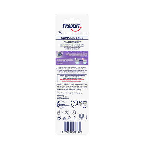 Prodent opzetborstels voor de elektrische tandenborstel zorgen voor een effectieve reiniging van je gebit en een frisse adem.- Prodent opzetborstels voor de elektrische tandenborstel hebben een compacte kop.- In elke tandenborstel zijn drie verschillende soorten borstelharen verwerkt.- Met Prodent opzetborstels voor de elektrische tandenborstel kom je zelfs op de moeilijkst bereikbare plekken van je gebit.- Zorgt voor tweevoudige reinigende werking en verwijdert meer tandplak dan een gewone tandenborstel.- Voor beter resultaat van je mondverzorging, adviseren tandartsen de opzetborstel iedere 3 maanden te vervangen.- De tandenborstels met compacte kop zijn stevig en gaan lang meeSinds 1935 een begrip op het gebied van tandenpoetsen: dat is Prodent. Een sterk en herkenbaar merk met veel trouwe fans. Steeds meer Nederlanders hebben last van specifieke mondproblemen en maar liefst 40% van de Nederlanders heeft last van gevoelige tanden. Andere veel voorkomende problemen zijn cariës, tandsteen en tanderosie. Prodent biedt specifieke oplossingen voor bijvoorbeeld gevoelige tanden, tandsteen, verkleuringen, vergelingen, een extra frisse adem en het kindergebit. Het begin van goede mondverzorging en witte tanden is een goede tandenborstel. Deze speciaal ontworpen Prodent opzetborstels met bewegende kop zorgt niet alleen voor de dagelijkse weerstand in de mond, maar bereikt ook zelfs de moeilijkste plaatsen in de mond. Dankzij de juiste grootte en de bijzondere plaatsing van de borstelharen, kom je overal goed bij, ook tussen de tanden en bij de achterste kiezen. De Prodent opzetborstels zijn voorzien van een ronde en compacte kop, makkelijk in gebruik, stevig en uitstekend geschikt voor dagelijks gebruik. De tandenborstel helpt gaatjes te voorkomen, vlekken te verwijderen en tanden te polijsten. Bestrijdt efficiënt verkleuringen en geelverkleuring. Kies voor een mooi en schoon gebit, met natuurlijk wittere tanden die mooi wit blijven. Lach je stralend witte lach, boost je zelfvertrouwen en maak een goede eerste indruk met een gezond, stralend schoon en prachtig wit gebit.